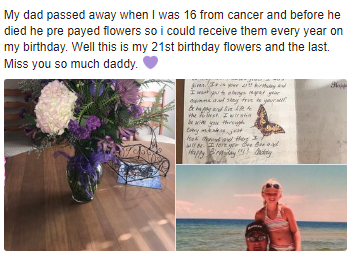 ADVERTISEMENT Before he died he had arranged and paid for flowers for every single birthday till I turn 21. I turned 21 today and these are the last flowers I am getting.”