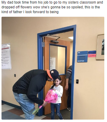 REDDIT - His father dropped off from work to go and give flowers to his sister in her classroom.