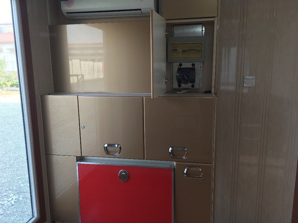 ”The expandable container house is with solar power and wind power system the top of the expandable container house with solar power generation, and wind power as a supplement, then lighting, television and refrigerator,totally use 250w power, which can be used continuously for 32 hours.”