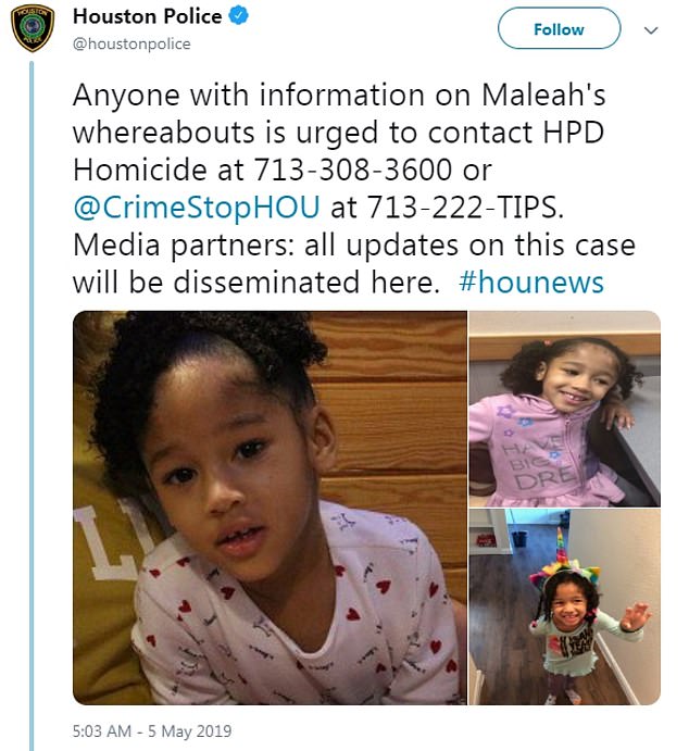 “Anyone with information on Maleah’s whereabouts is urged to contact HPD Homicide at 713-308-3600 or @CrimeStopHOU at 713-222-TIPS,” the Houston Police wrote.