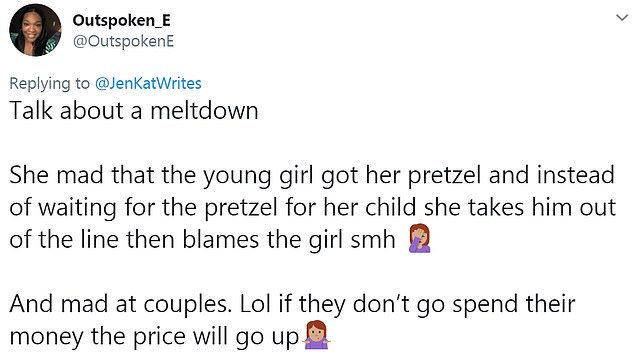 “This c–t in some very SLU**Y shorts was buying a Mickey pretzel and Aiden wanted one but the line was very long so I said later and it broke his poor little heart and he cried. I WANTED TO TAKE THAT F*****G PRETZEL FROM THAT TRAMP LIKE THANKS B***H YOU MADE MY SON CRY!