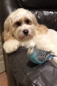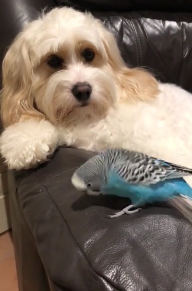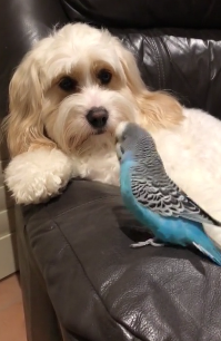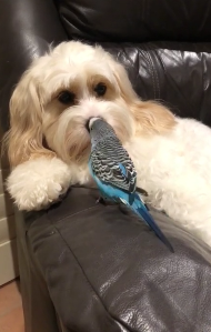 Even in the video the cute budgie, Charlie loves to talk to the dog, Lucy. They together celebrate a gala time and enjoy each other’s company.