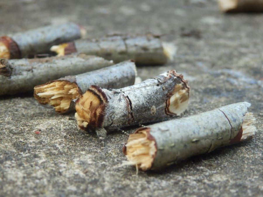 Buff-tip moths belong to the Notodontidae family and can be found across Europe and Asia. Adults may have a wingspan of up to three inches. Their bodies resemble broken twigs to avoid detection by predators.