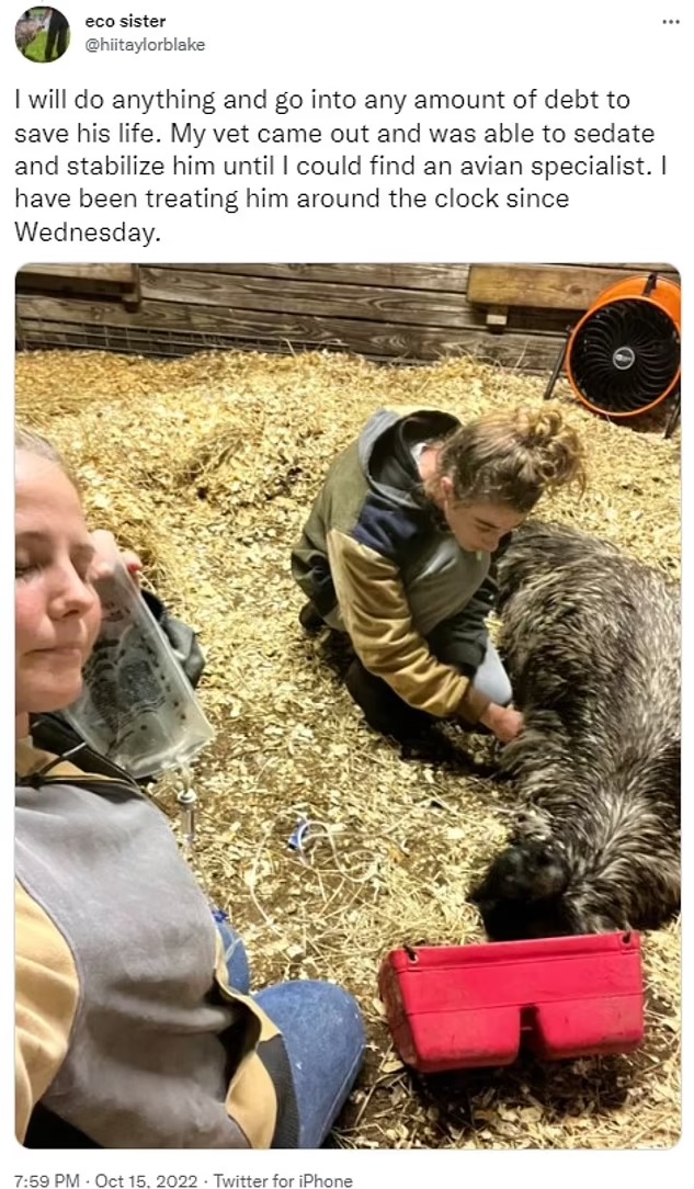 While Emmanuel is still in critical condition, his caretaker claimed the 120-pound 5-foot bird is a real “fighter” who has a good chance of pulling through.