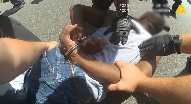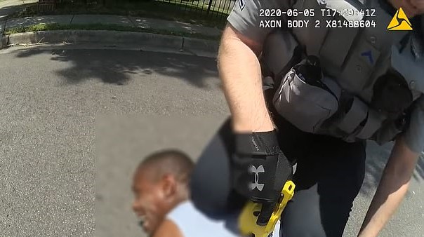 The officer pressed his knee into the man’s back, telling him to relax but appeared to strike him with the gun. For a short moment, the camera footage was covered but the sound of the stun gun being used can be heard.