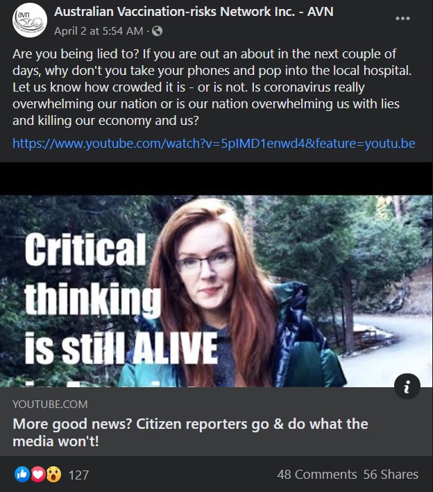 Along with their controversial message, the AVN also shared a video of a fellow anti-vaxxer who allegedly had her followers do some digging and question health workers about the situation and number of patients at their hospitals.