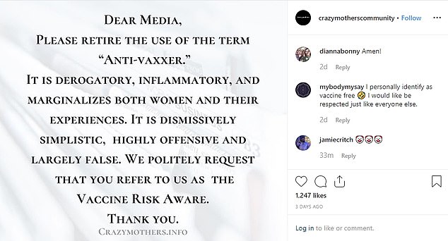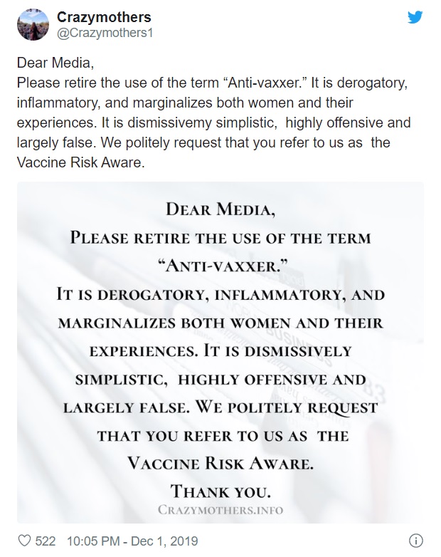 “It is derogatory, inflammatory, and marginalizes both women and their experiences. It is dismissively simplistic, highly offensive and largely false. We politely request that you refer to us as the vaccine risk aware. Thank you!”