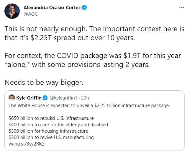 Alexandria Ocasio-Cortez, also known as AOC, puts context as to how much the administration should be spending not only for its economy, but for the nation to not plummet like it did once COVID19 began. Spreading out $2.25 trillion to an entire nation will not support the country in the next ten years, the COVID package for this year *alone* was $1.9 trillion, accommodating for time will need the bill to be racked up to at least $10 trillion.