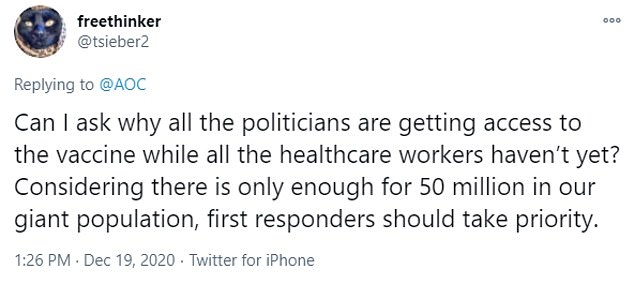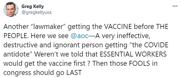 Another wrote: “I heard what @AOC said about continuity of government etc. in vaccine distribution and I still think it’s positively obscene that politicians who denied and downplayed the severity of it are getting the shot before frontline healthcare professionals. Disgusted.”