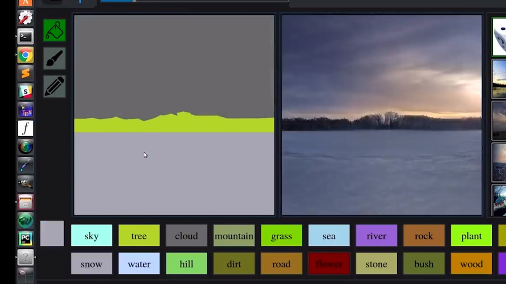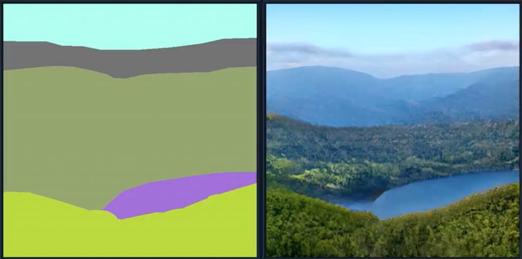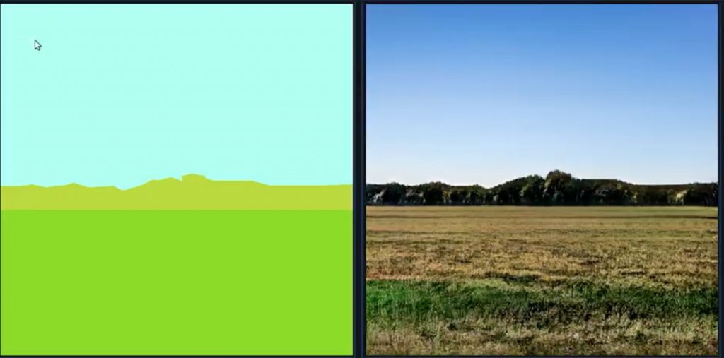 “It’s like a coloring book picture that describes ‘here’s where a tree is, where the sun is, where the sky is’ – and then the neural network is able to fill in all of the detail and texture, the reflections, shadows, and colors, based on things that its learned form a large database of real-world images.”