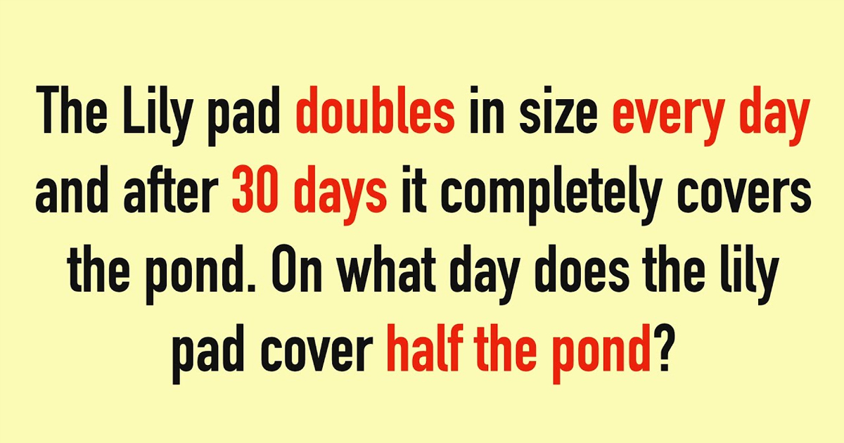 The right answer is the 29th. And that’s because the pond is half full, the day before it’s completely full.