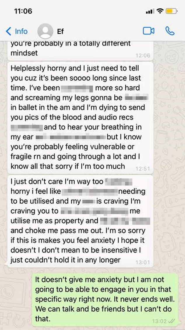 One of the messages read: “Helplessly horny and I just need to tell you cuz it’s been sooo long since last time.”