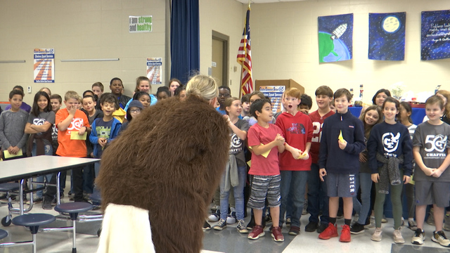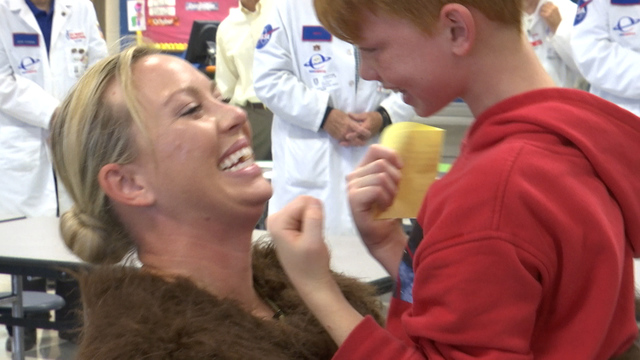 Her son, Kael Lancey, who is in fifth grade at Chaffee Elementary School, was working on a school project with other children when his mother surprised him.