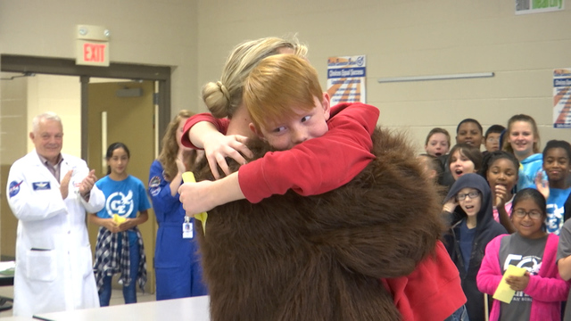 The mother showed up as the school’s eagle mascot. She said before surprising her son: “My heart has been racing all morning! I have been so nervous.”