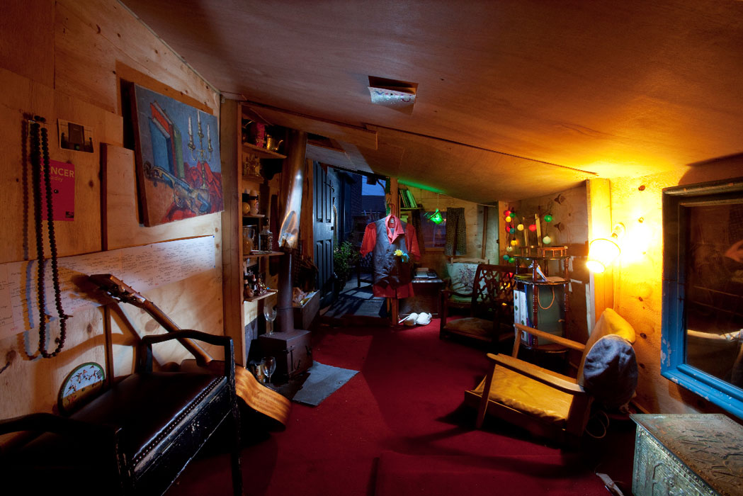 Tony crawls through a tunnel-like entrance to get into his room. The staircase of his house is made of rickety chairs while he has his bathroom in an old wardrobe.