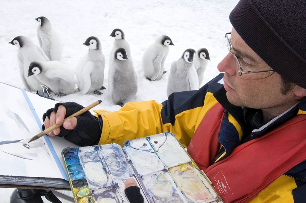 A dedicated artist has been fighting hypothermia and freezing winds for over 15 years in order to paint the landscape in peace and quiet surrounded by penguins.