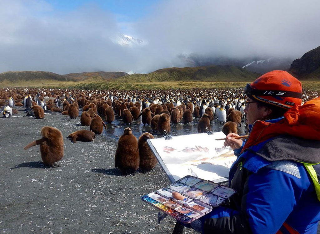 As the landscape painter explained, he starts his journey in the Falkland Islands from where he makes his way to Antarctica to capture the wildlife populations and mesmerizing landscape on canvas.