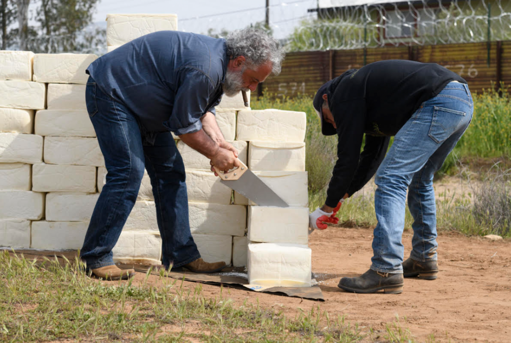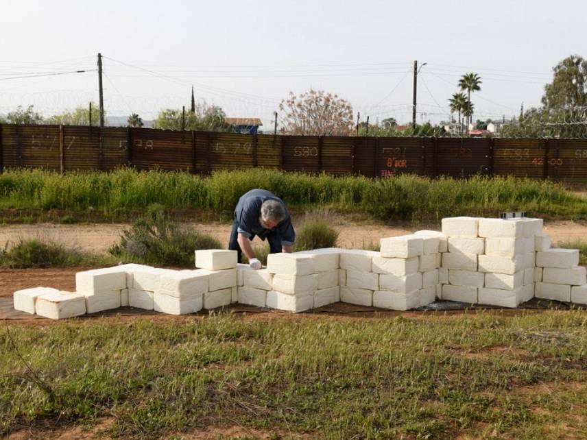 He began stacking the blocks in Tecate, California, the Los Angeles artist has completed 30 feet of the wall.