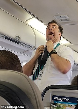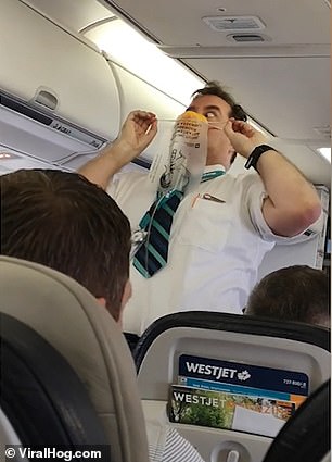 A flight attendant on the WestJet trip from Alberta, Canada, to Arizona delivered a funny and silly demonstration that had everyone on the flight in fits.