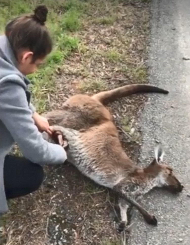 When the women stopped to check the animal, they realized that it had died after getting hit by a car. Upon a closer look, they found that the kangaroo was not alone and had a small joey inside its pouch.