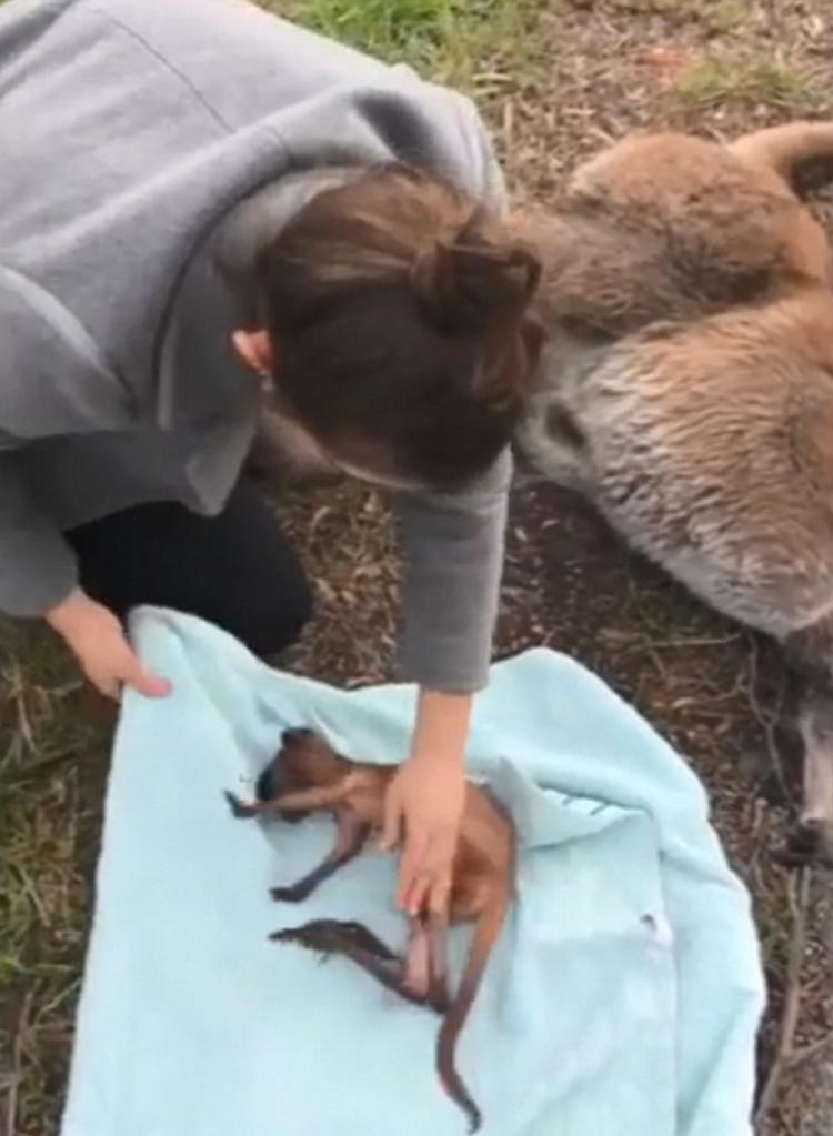 A heartwarming video shows the moment an Australian woman rescues a baby kangaroo from the pouch of its dead mother.