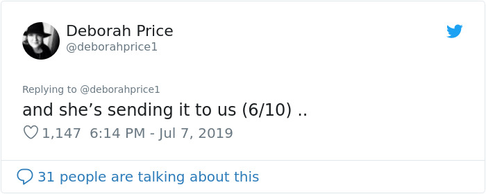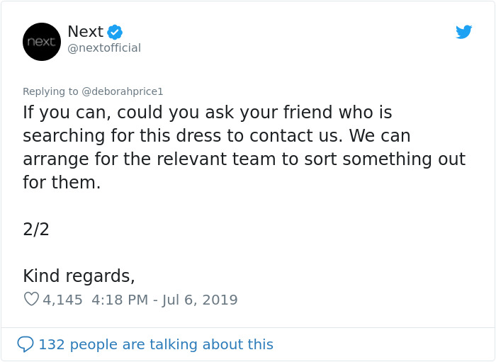 The next day, Deborah thanked the retailer Next for reaching out to their supplier to see if they could make additional batches of the dress. She also thanked people that were sending the dresses they had.