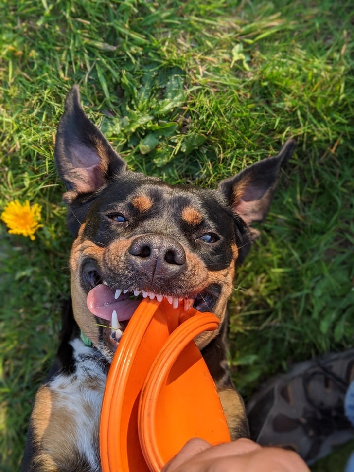 - Maya’s favorite time is frisbee time. And, the smile says it all.