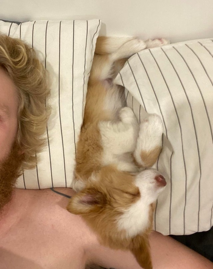 - This new puppy only has one way of sleeping, and it is between the pillows.