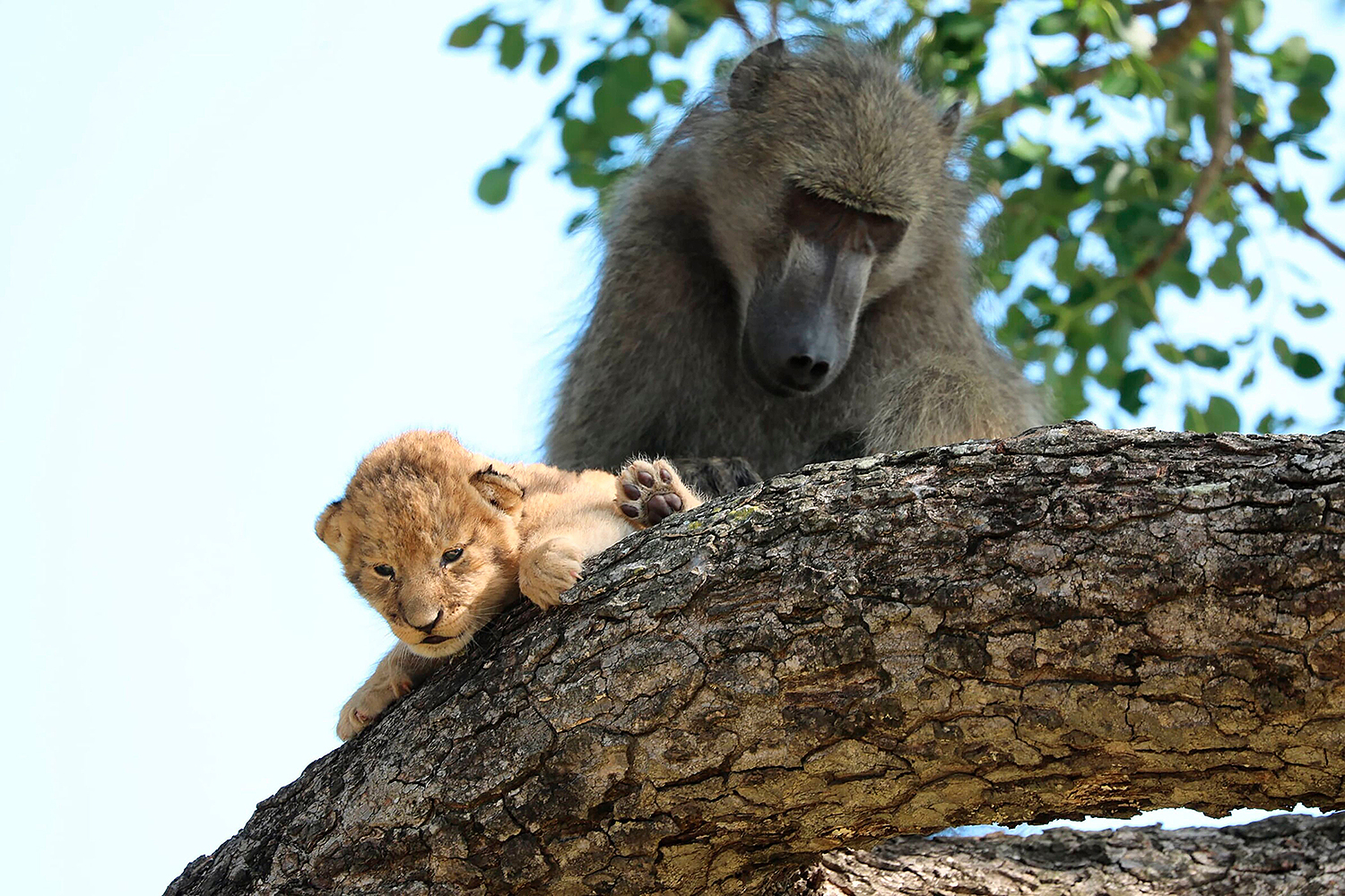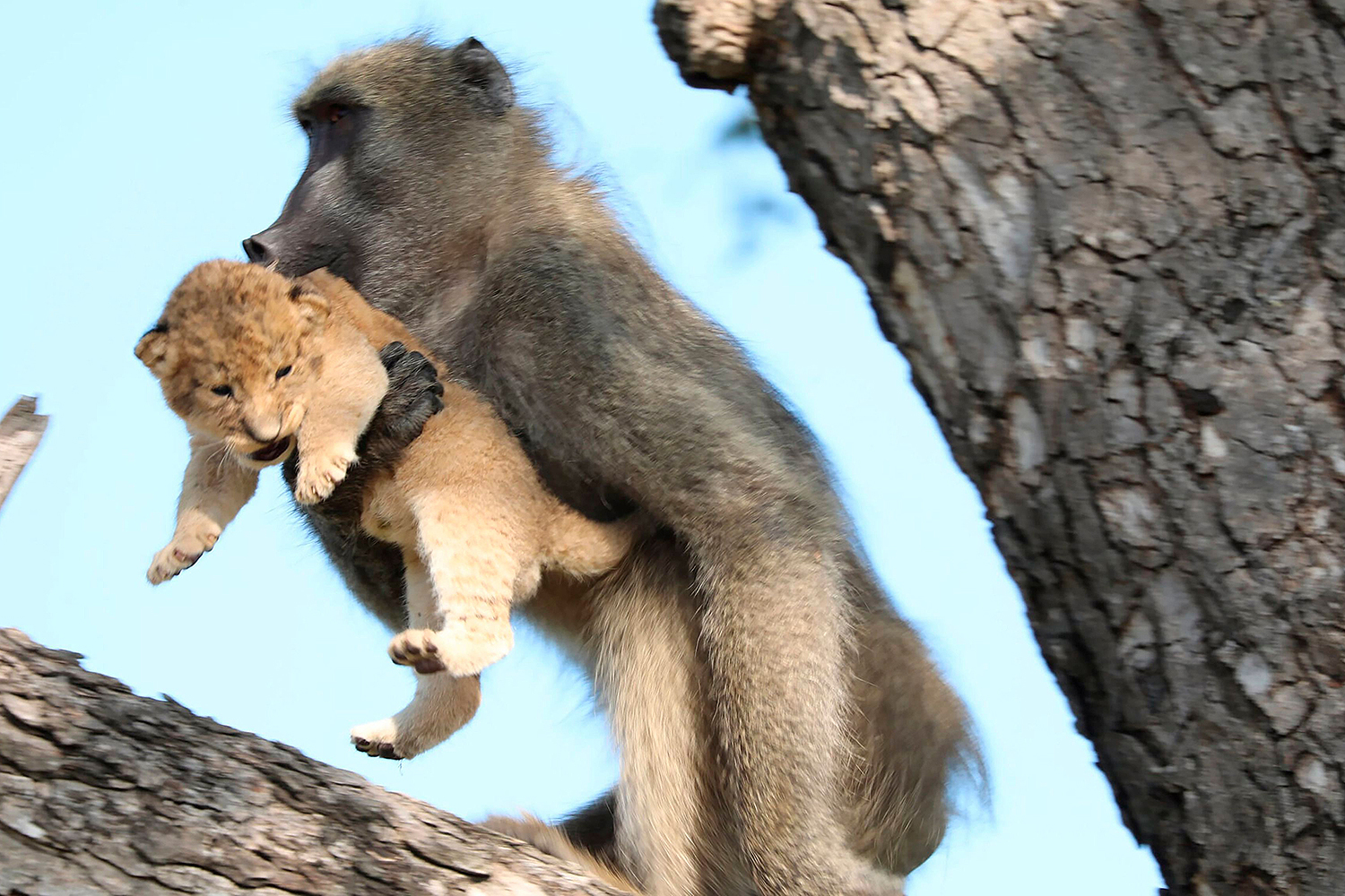 He was a little surprised to see a large male baboon carrying a tiny lion cub on a tree.
