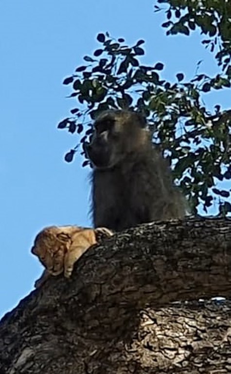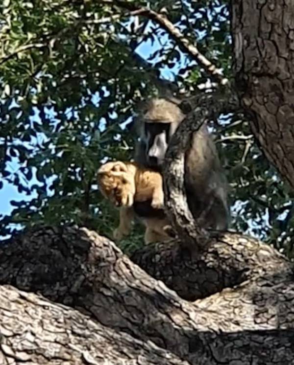 “Its lion cub is still very much alive and the baboon is busy grooming it.”