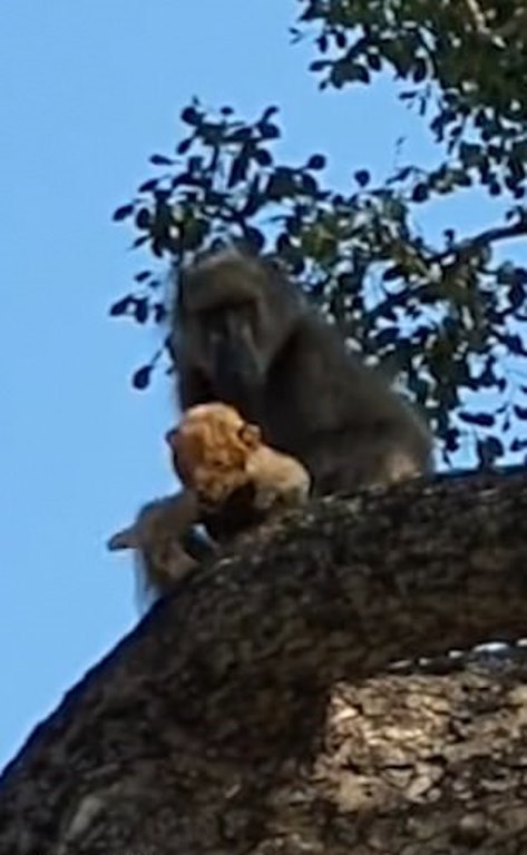 A baboon was looking for food when it decided to steal a cub from its pride before taking it into the treetops.