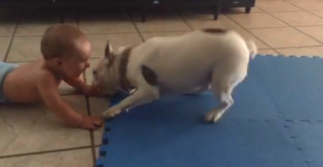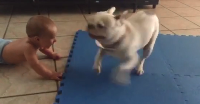 The bulldog here is in love with his little brother and keeps jumping around him all day and the baby is equally in love with the dog too.