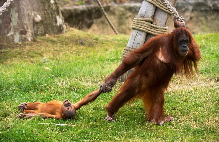 A cute baby orangutan threw a tiny tantrum when his mother dragged him away from playtime.