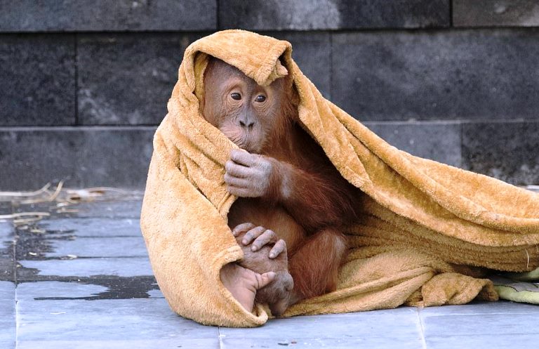 More photos of the little orangutan show his playful nature. Other snaps show him enjoying a sip of water after playing and snugging under a yellow blanket.