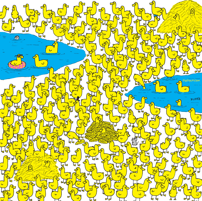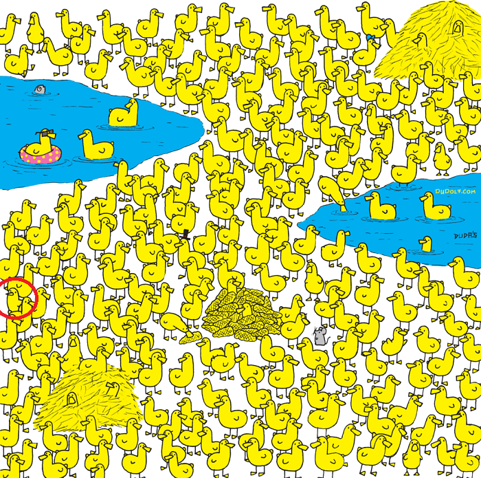 In this tricky puzzle, challengers must find the baby chick waddling among the ducklings. Do you think you can find it without any help?