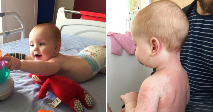 The first symptoms of the child’s illness was a pinprick rash, swollen lymph nodes, and a high fever. He then developed severe sickness and the soles of his feet and his hands turned red.