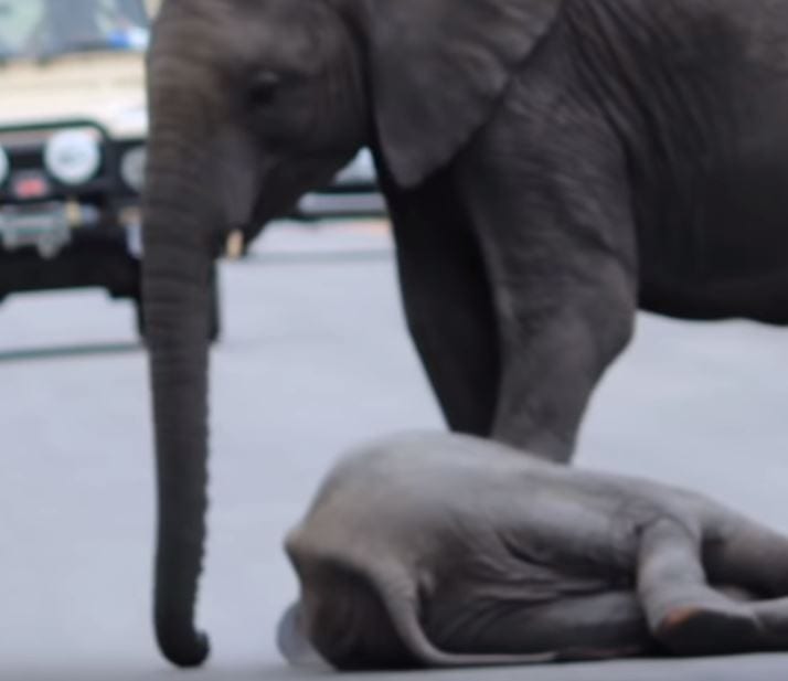 People were watching the animals from their vehicles when a little elephant suddenly stumbled on the ground. The calf fell on its knees before lying flat on the road, where it remained unconscious.