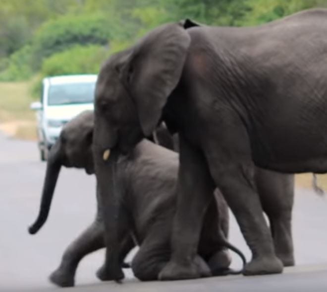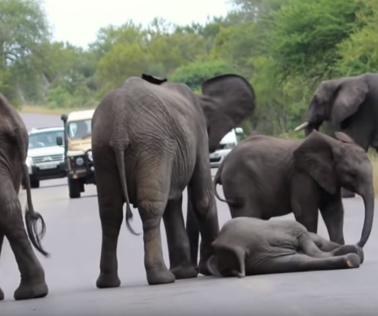 In the Kruger National Park in South Africa, a herd of elephants was seen gathering to help their little fellow. This shows that their strong bond is touching beyond our beliefs.