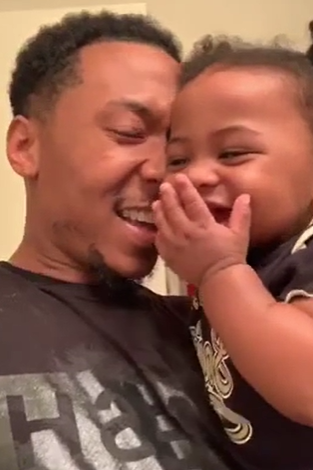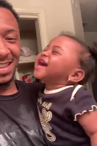 Apparently, the funny noise her father is making is amusing her and is making her laugh like a little baby, and yes she is one herself.