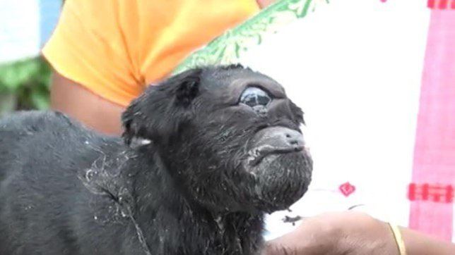 A baby goat was born with one large eye in the middle of its forehead in Assam, India.