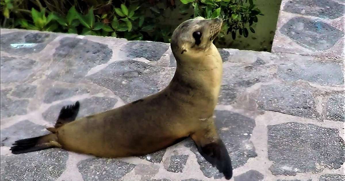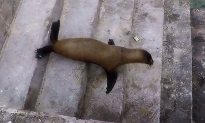 An adorable video has emerged that shows a baby sea lion enjoying a stroll on the sidewalk near the shore.