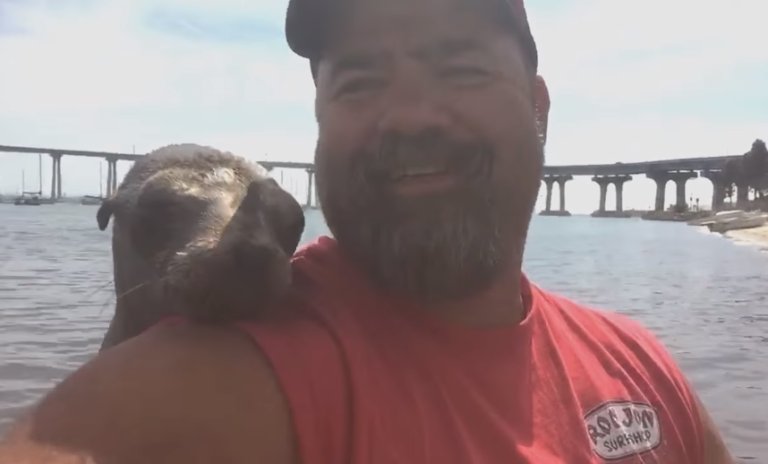 The man started filming the rare moment and the sea lion can be seen in the video resting its head on the man’s shoulder.