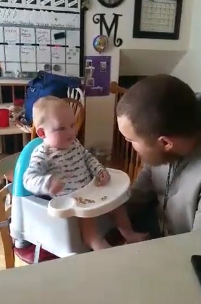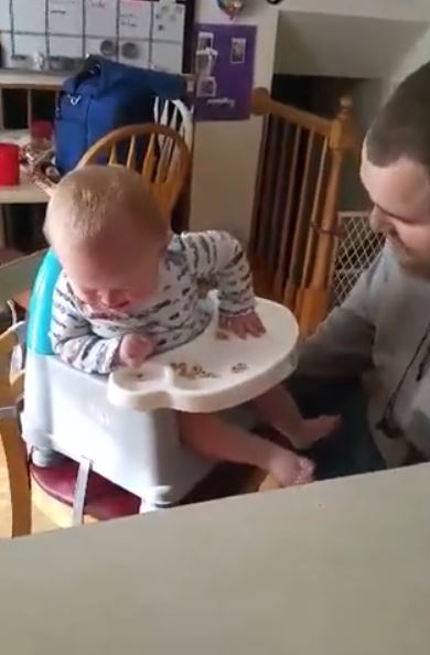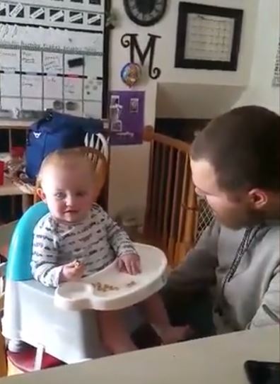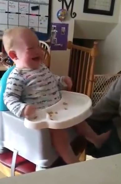 While Miles was having a fun time in his high chair, his father started telling him a joke.