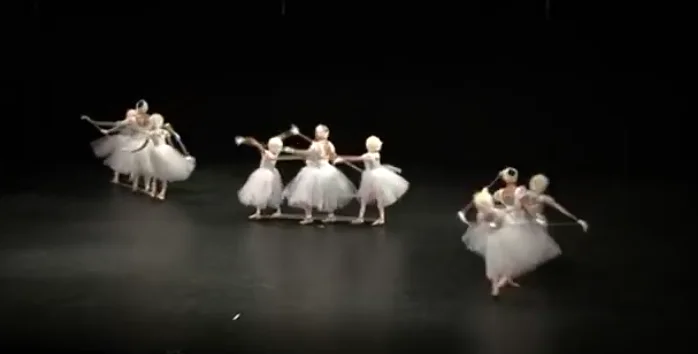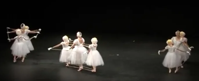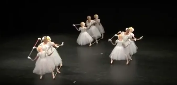 3 women perform ballet routines while they are connected to 2 dolls each, and it’s funny.