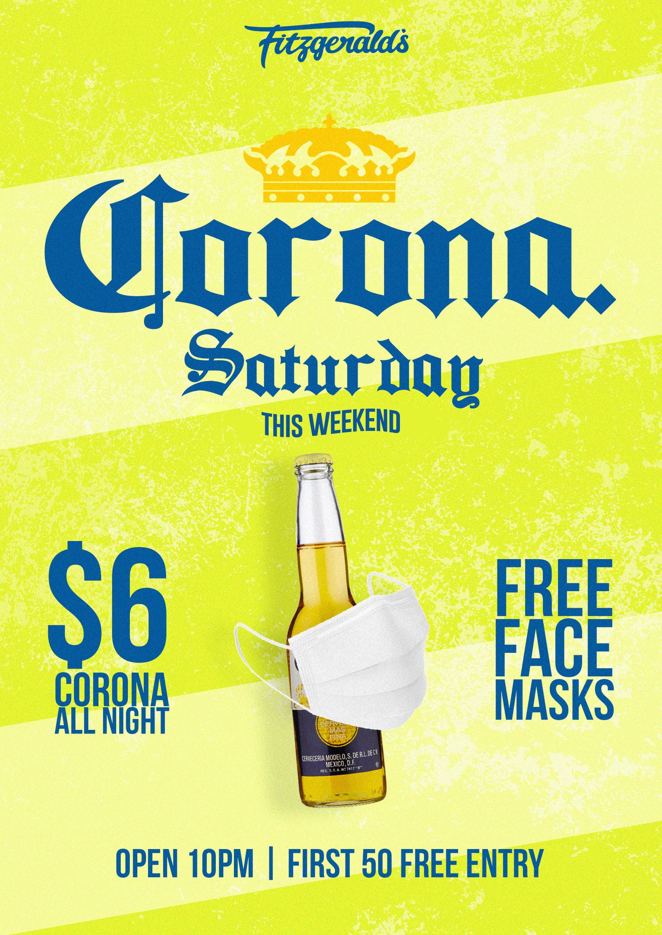 “$6 CORONA’S ALL NIGHT THIS SATURDAY. We dare you to find a better special. We (sort of) promise they aren’t contaminated.”