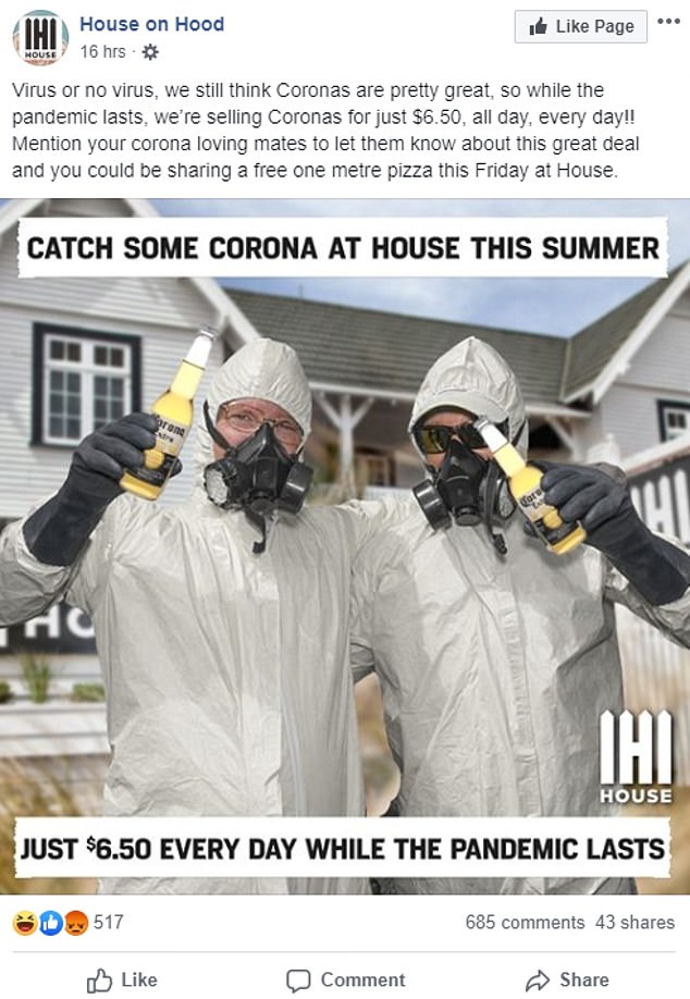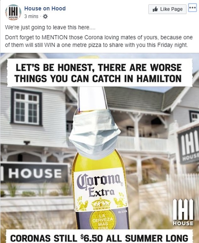 Just days earlier, another bar in New Zealand was slammed by the public after they came up with coronavirus-themed ads to promote their special Corona deal that offers a discount on the beer brand while the outbreak lasts.
