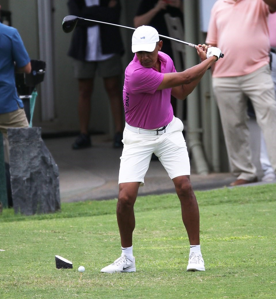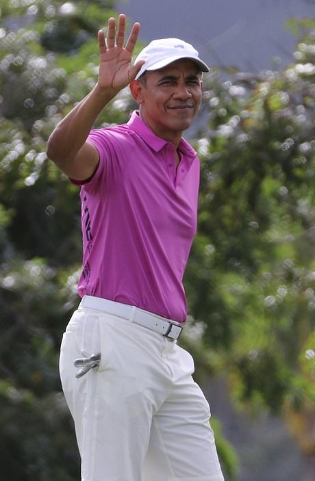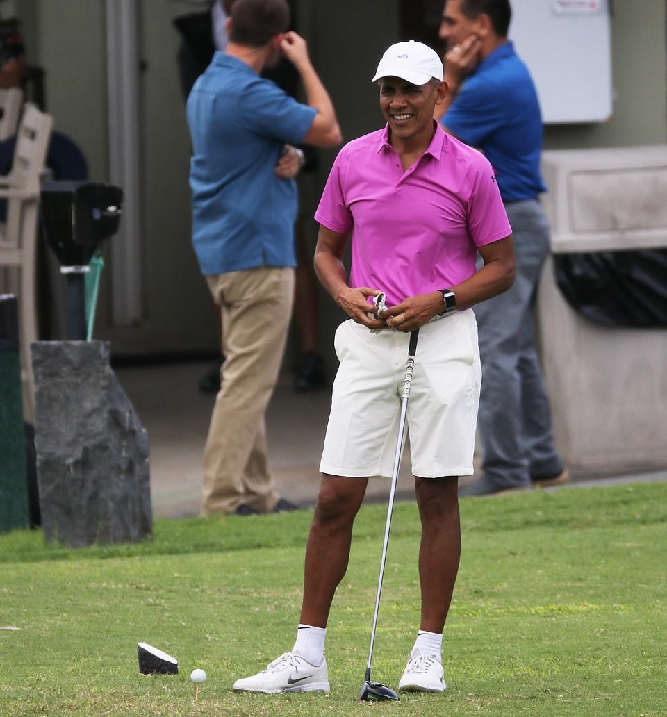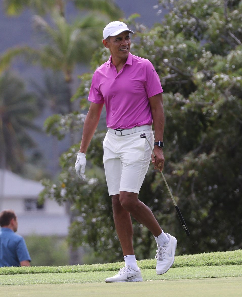 Mr. Obama donned white shorts and a pink shirt for the occasion. In addition, he happily waved and smiled at the cameras while enjoying golf.