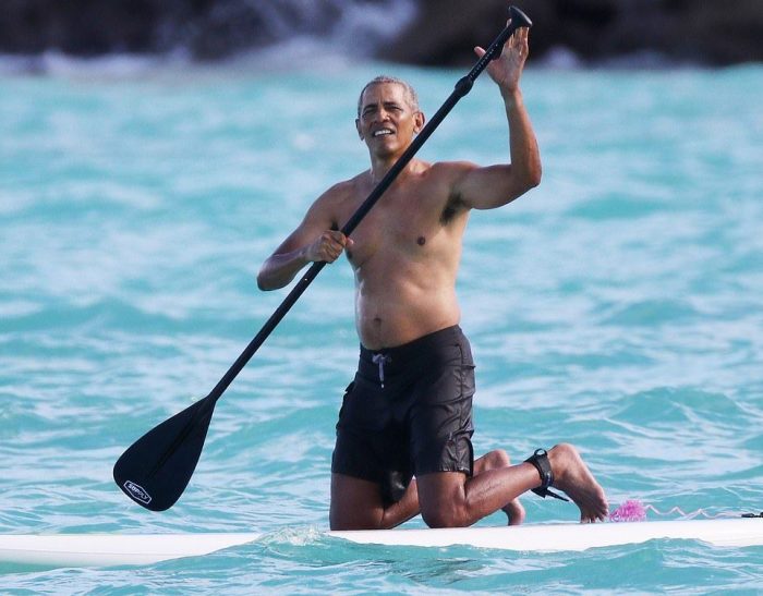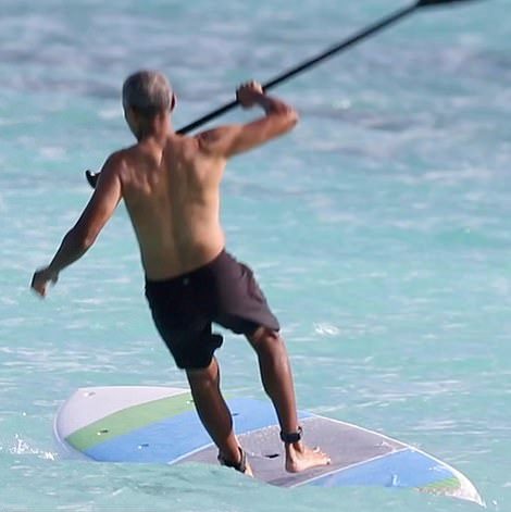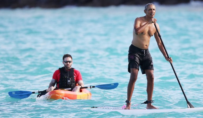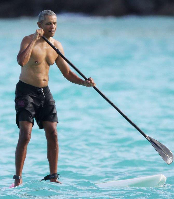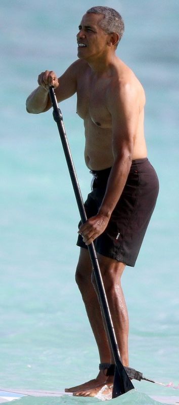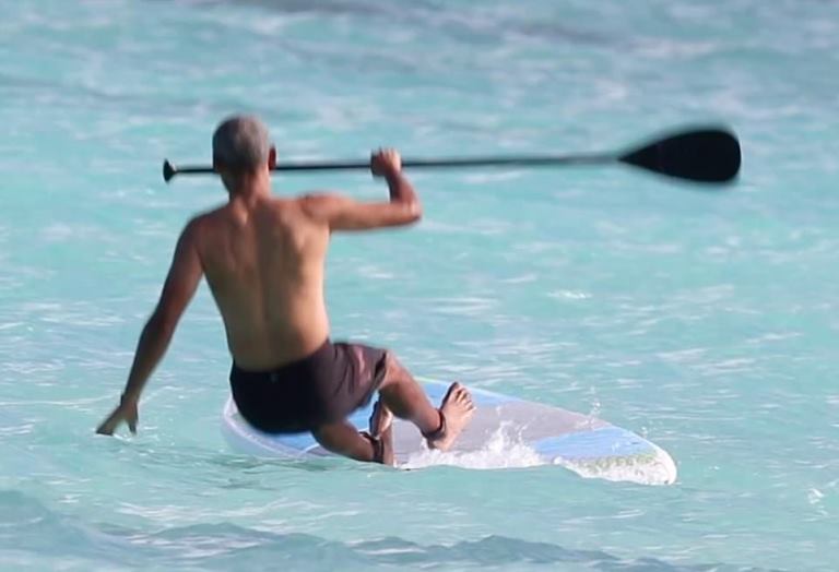 The former president was standing on a light-colored paddleboard while wearing a ‘shark deterrent’ band around his ankle.