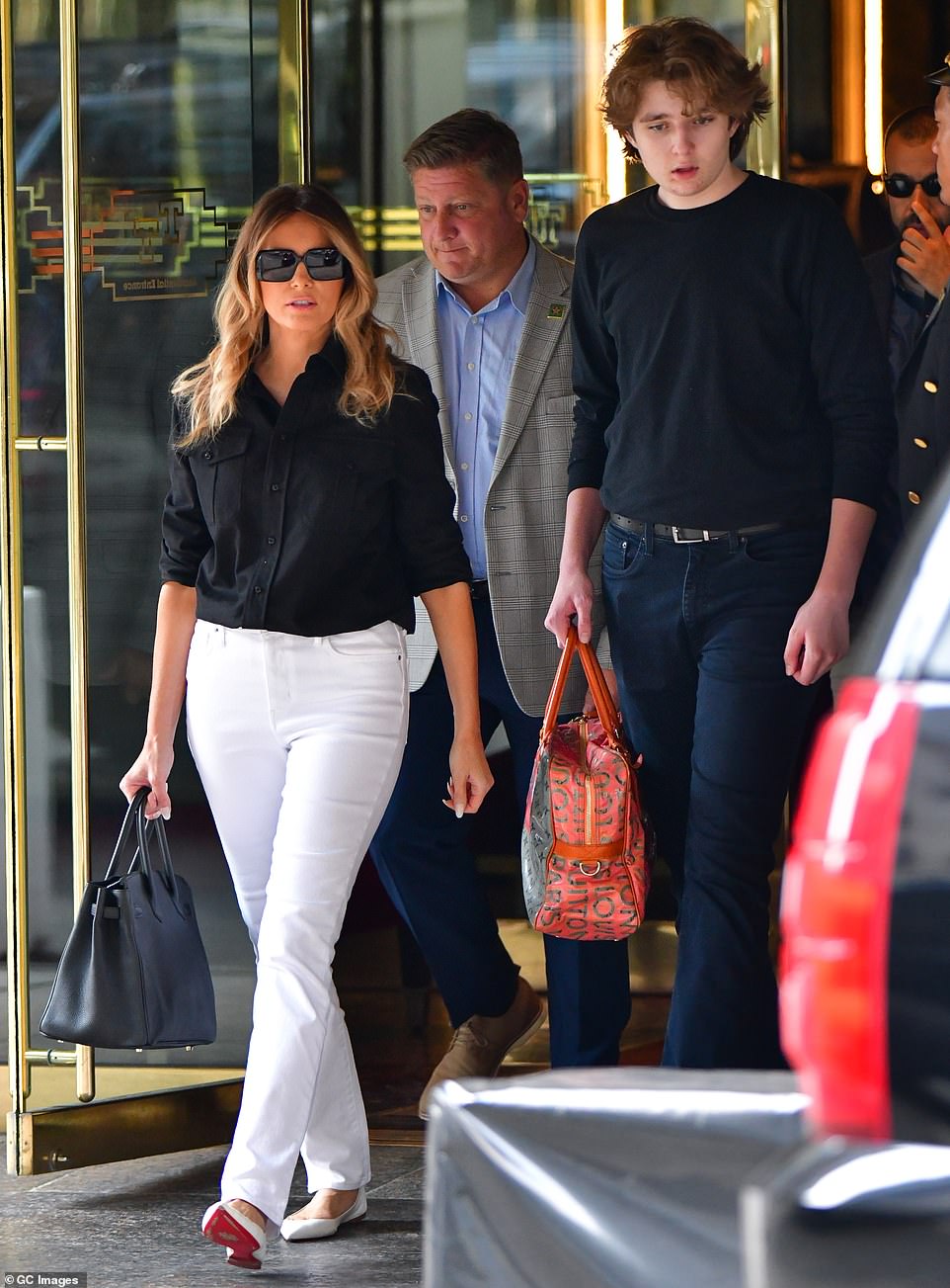 As you can probably expect, Melania looked effortlessly chic too, donning a tailor-fitted buttoned-down shirt in black, while pairing her look with white pants and trendy shades and pointed flats from Christian Louboutin.