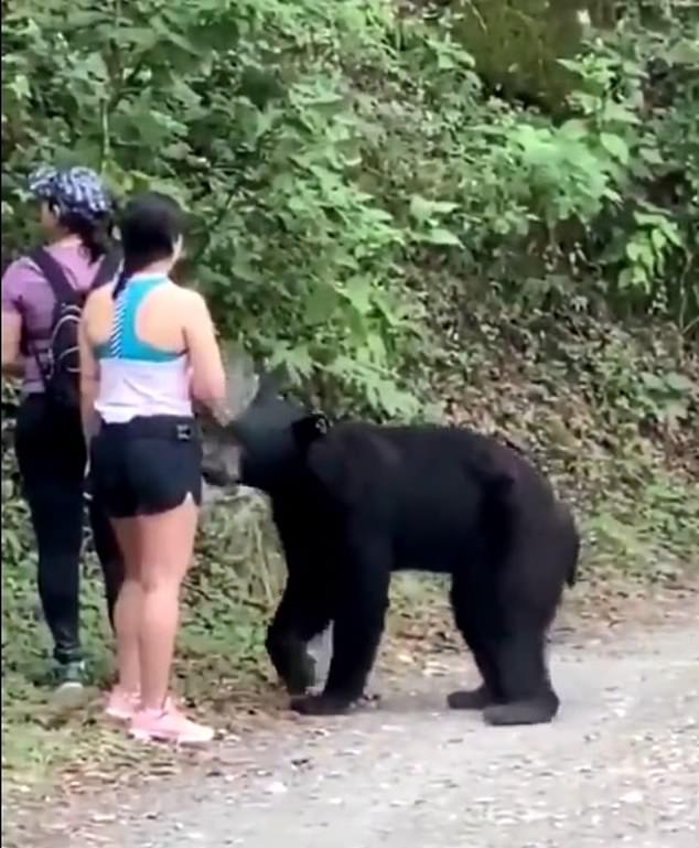Other hikers tried to distract the animal but its curiosity prevailed. The bear continued sniffing the woman’s head while her friends waited for the adorable creature to leave.